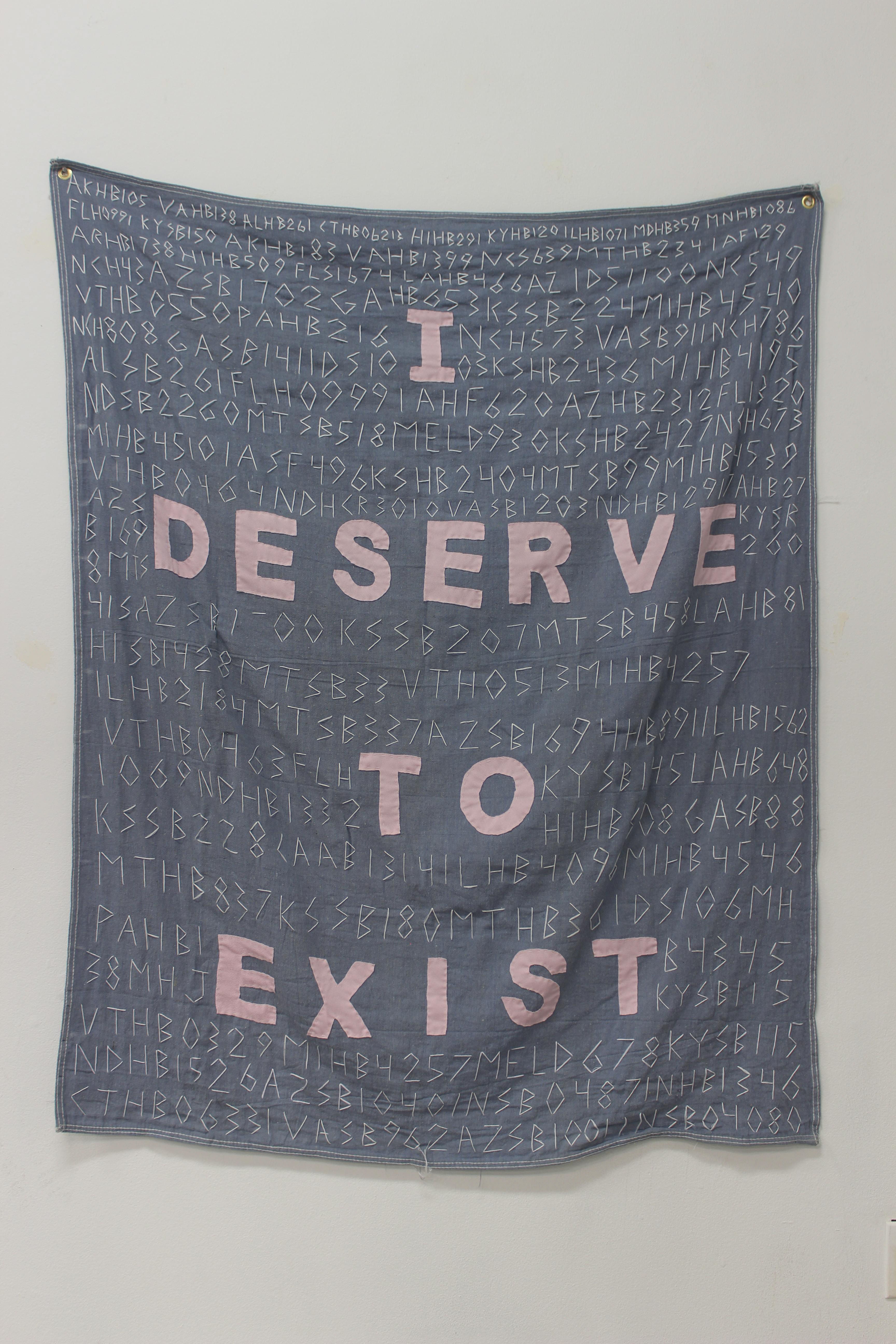 This work is a hand sewn banner listing real titles of anti-transgender bills in the united states. The wall of text shows the sheer scale legislation. I paired this sprawling list with a simple message, I DESERVE TO EXIST. I also included my sketchbook for this work as it shows how few of the 517 bills make up those listed in the work.